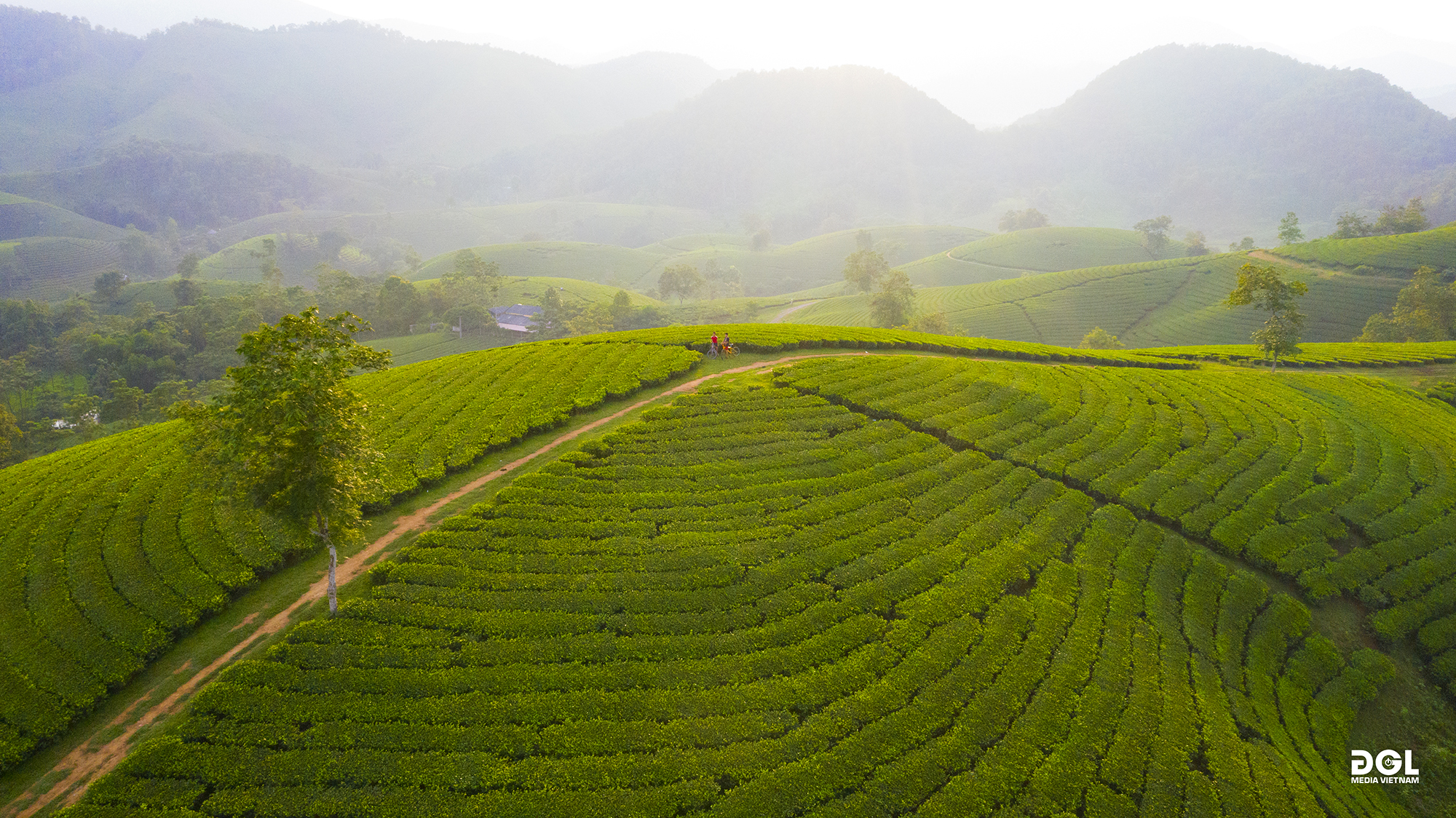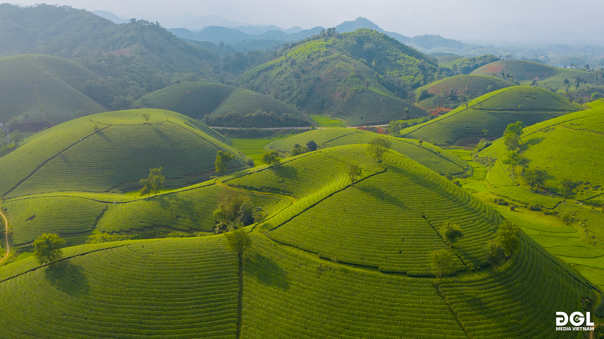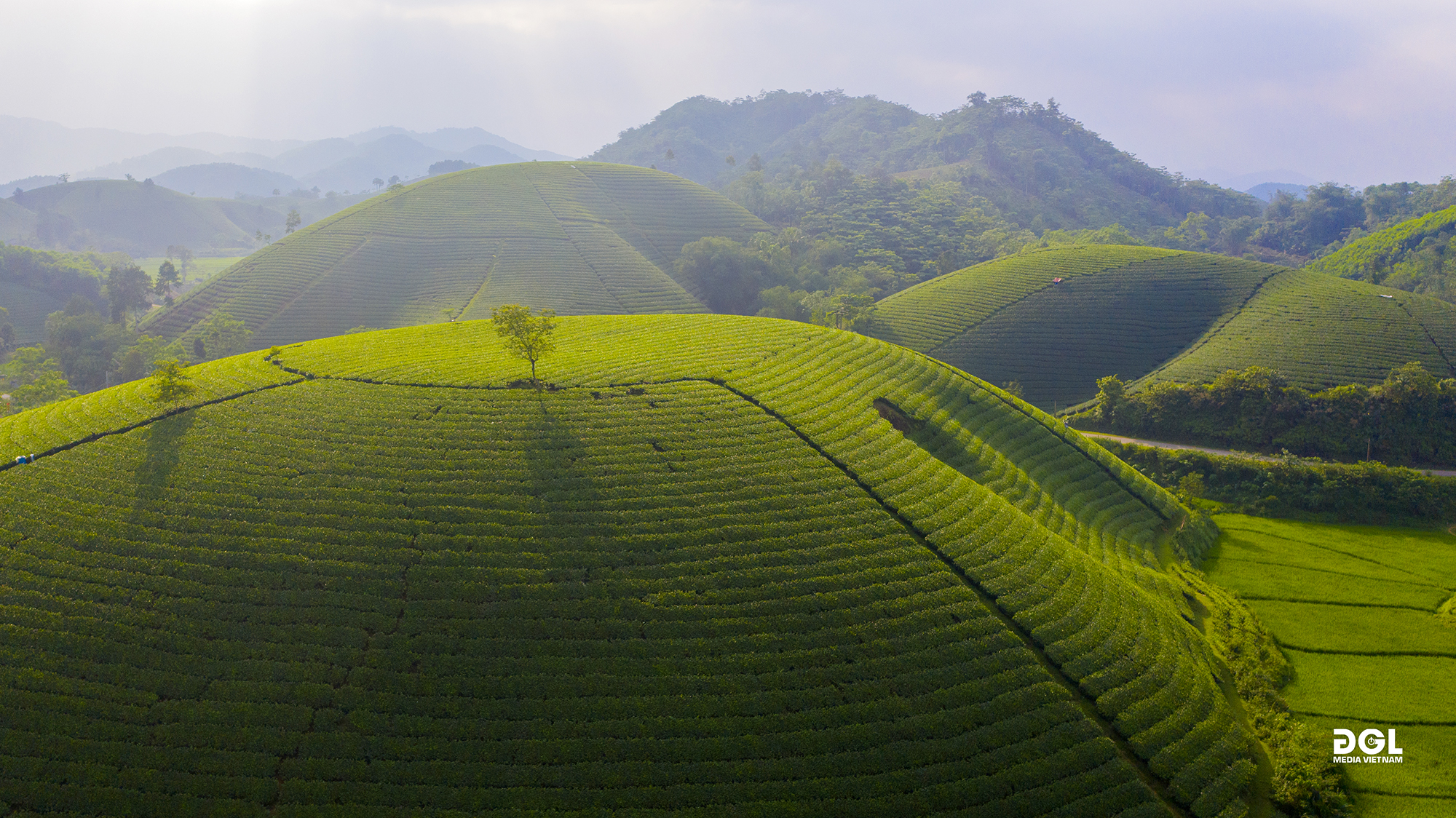 Nằm dọc hai bên cung đường uốn lượn là những đồi chè trải dài, xanh mướt nhấp nhô bát ngát nối tiếp nhau đến tận chân trời. Vr360 toàn cảnh: http://uploads.dglmedia.vn/2023/longcoc/vr360/