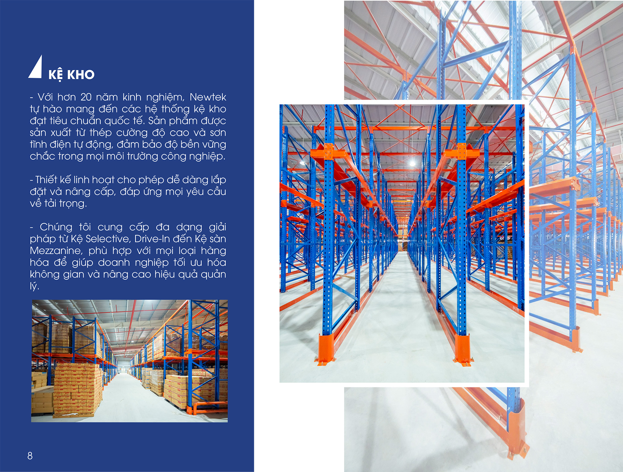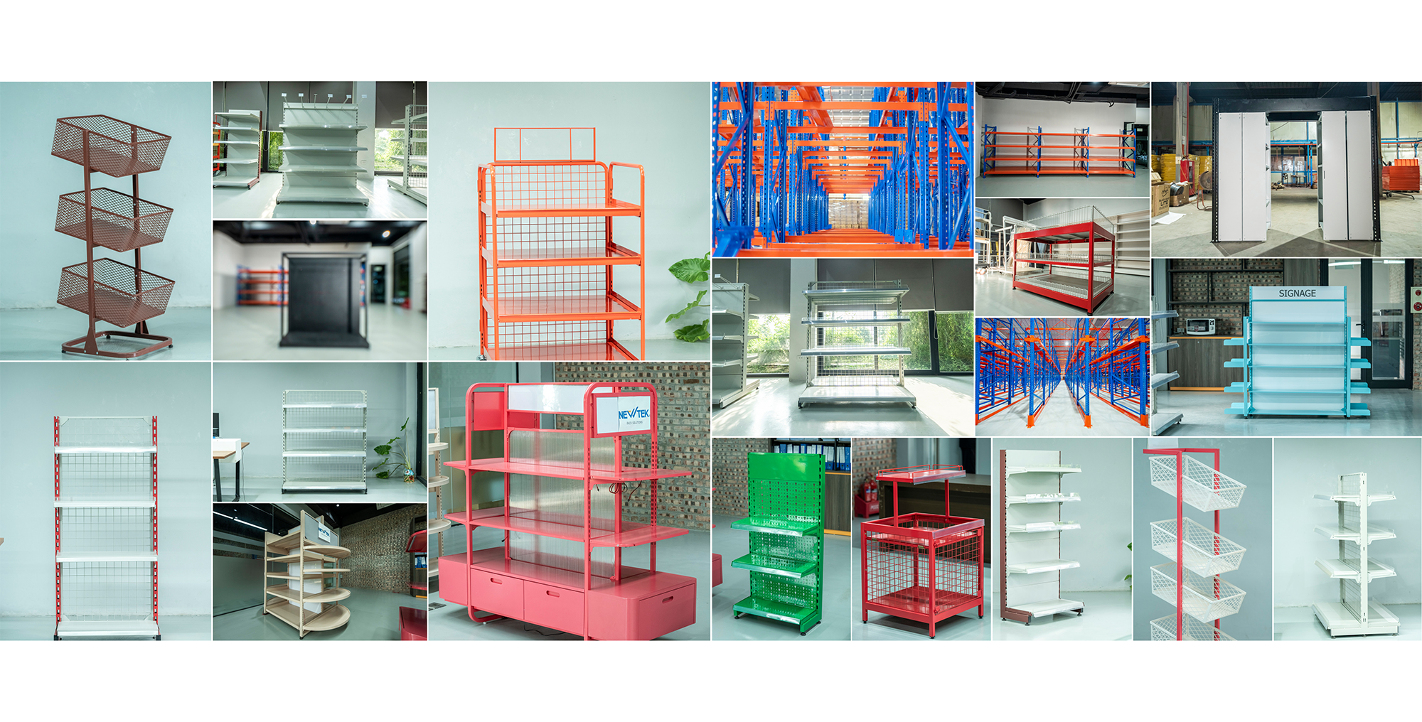 Những sản phẩm tiêu biểu của Newtek như: Giá Kệ kho công nghiệp Logistic, Giá kệ siêu thị, kệ thời trang, giá kệ cho thiết kế đặc biệt...với những tải trong lớn như Giá kệ hạng trung tải có ray trượt Roller 2000 mm, Giá kệ Drive, Giá kệ Selective/pallet ... Những sản phẩm giá kệ Newtek tải trọng lớn từ 50 kg đến 1000 Kg/ 1 tầng với tiêu chuẩn khắt khe nhất từ khách hàng đã được Newteck tiên phong phát triển và sản xuất